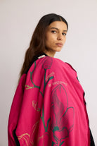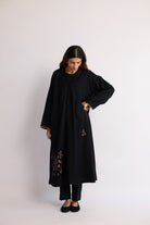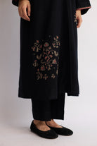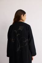 This black overlay is a striking statement piece, featuring an exquisite hand-embroidered plant motif with berries and a pair of majestic 18th-century-inspired phoenixes. The embroidery, enriched with fine threadwork and delicate bead highlights, adds depth and a subtle shimmer to the design. A contrast lining carries the message ‘अविराम’ (Aviram), symbolizing an unstoppable spirit. The back of the overlay features a beautifully detailed embroidered motif, ensuring elegance and artistry from every angle — a true fusion of heritage craftsmanship and timeless sophistication.