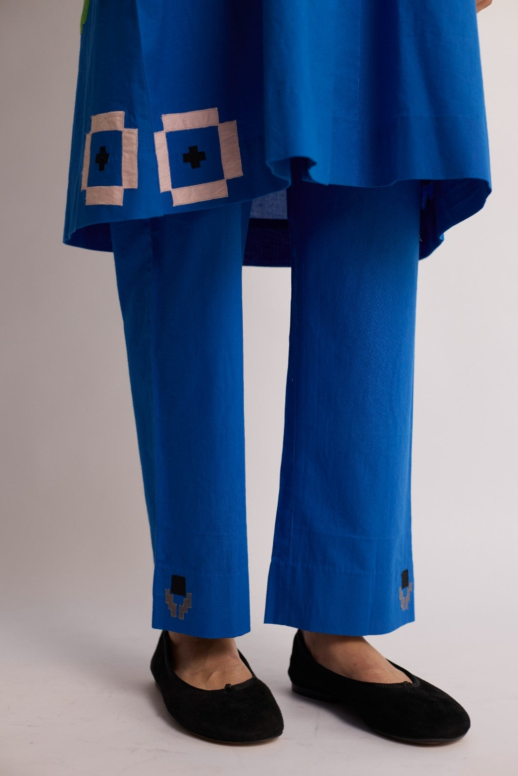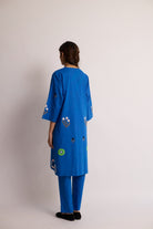 This kurta set features geometric and grid appliqué flowers that beautifully merge structure with softness, and subtle threadwork enhances the design.