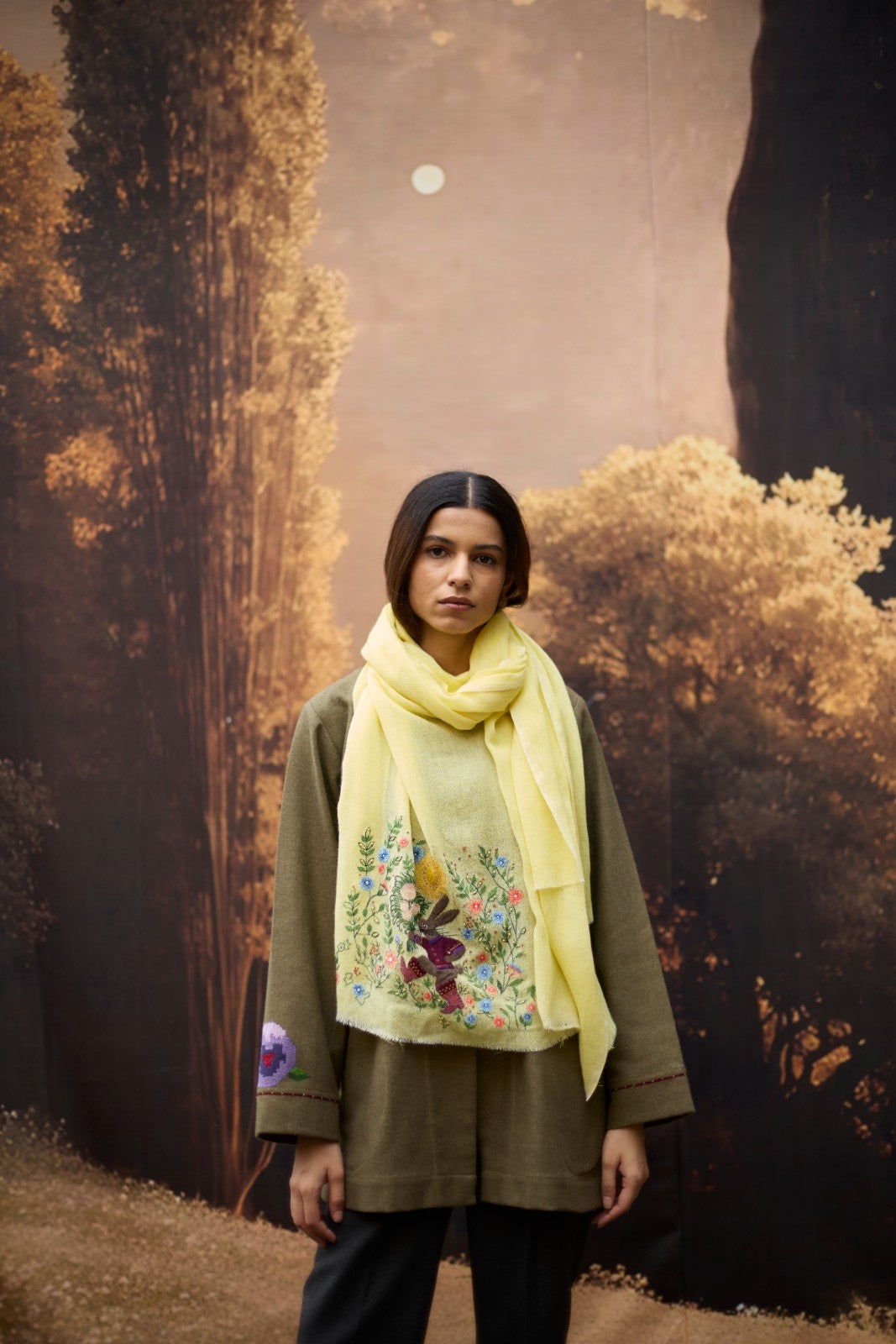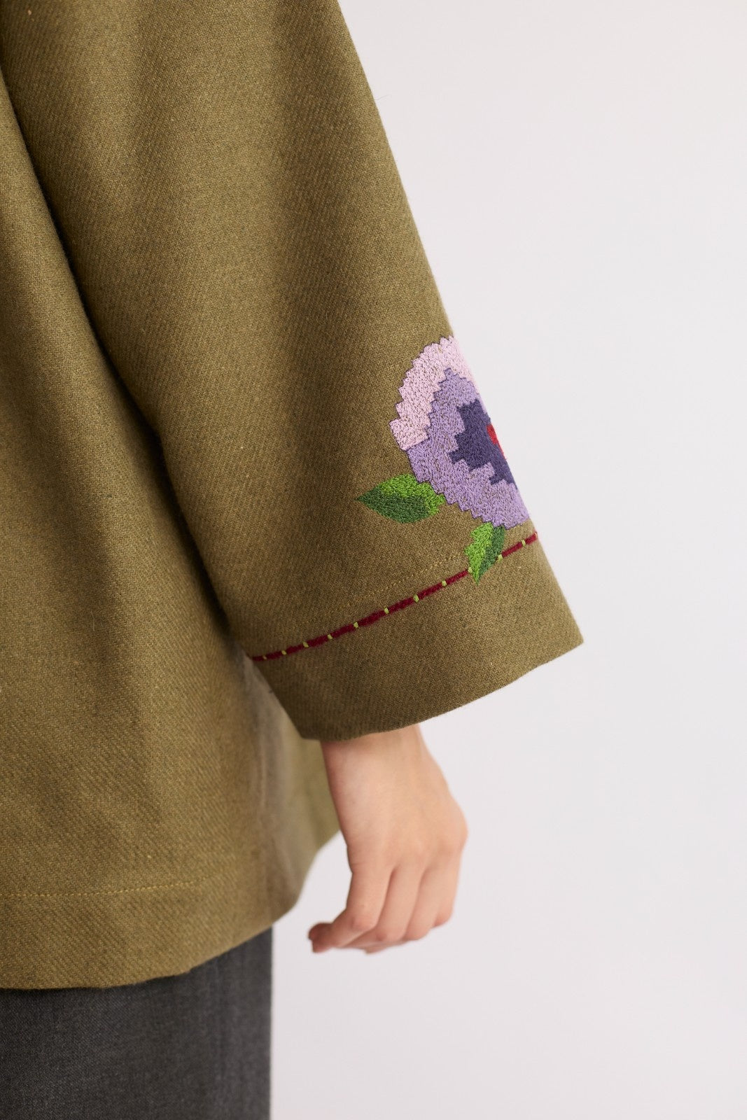 The Violet Leaf jacket features wool detailing on the neck and pocket accents that add warmth and texture to the design. The statement embroidered flowers on the sleeves bring a touch of elegance and artistry, making this piece a perfect blend of comfort, craftsmanship, and contemporary charm.