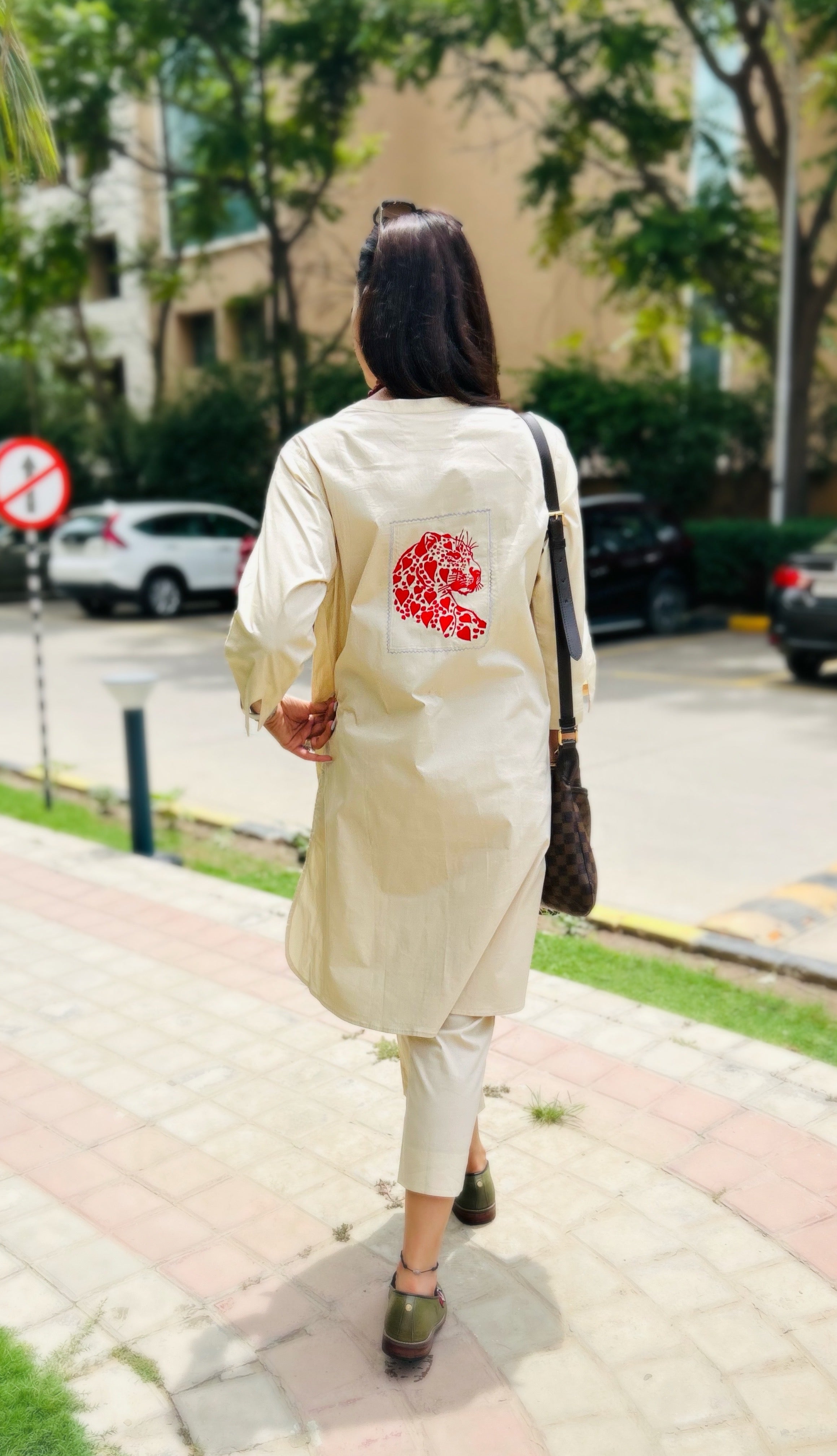 Machine work Tiger motif on the front and back with lace detailing on the armholes