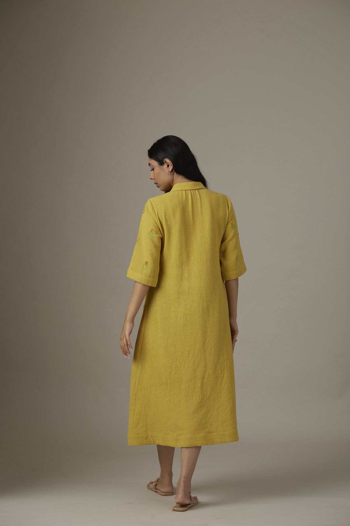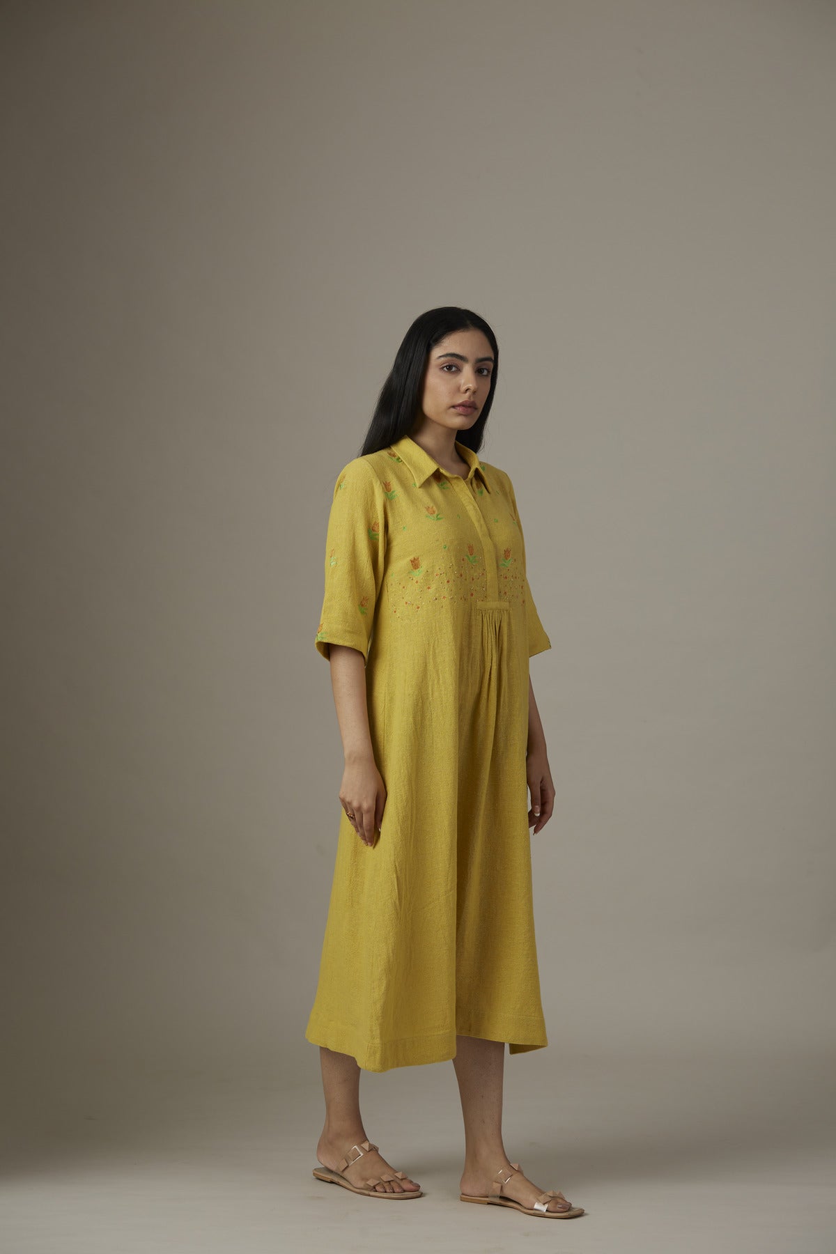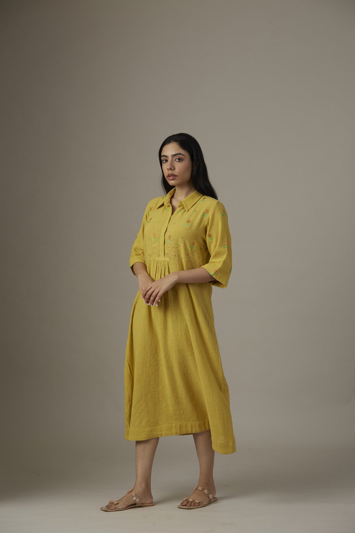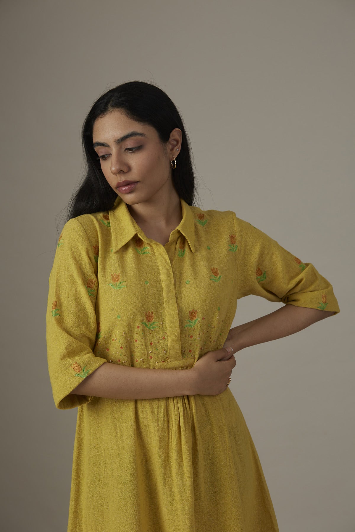 Embroidered tulip flower on the yoke and sleeves highlighted with beads.