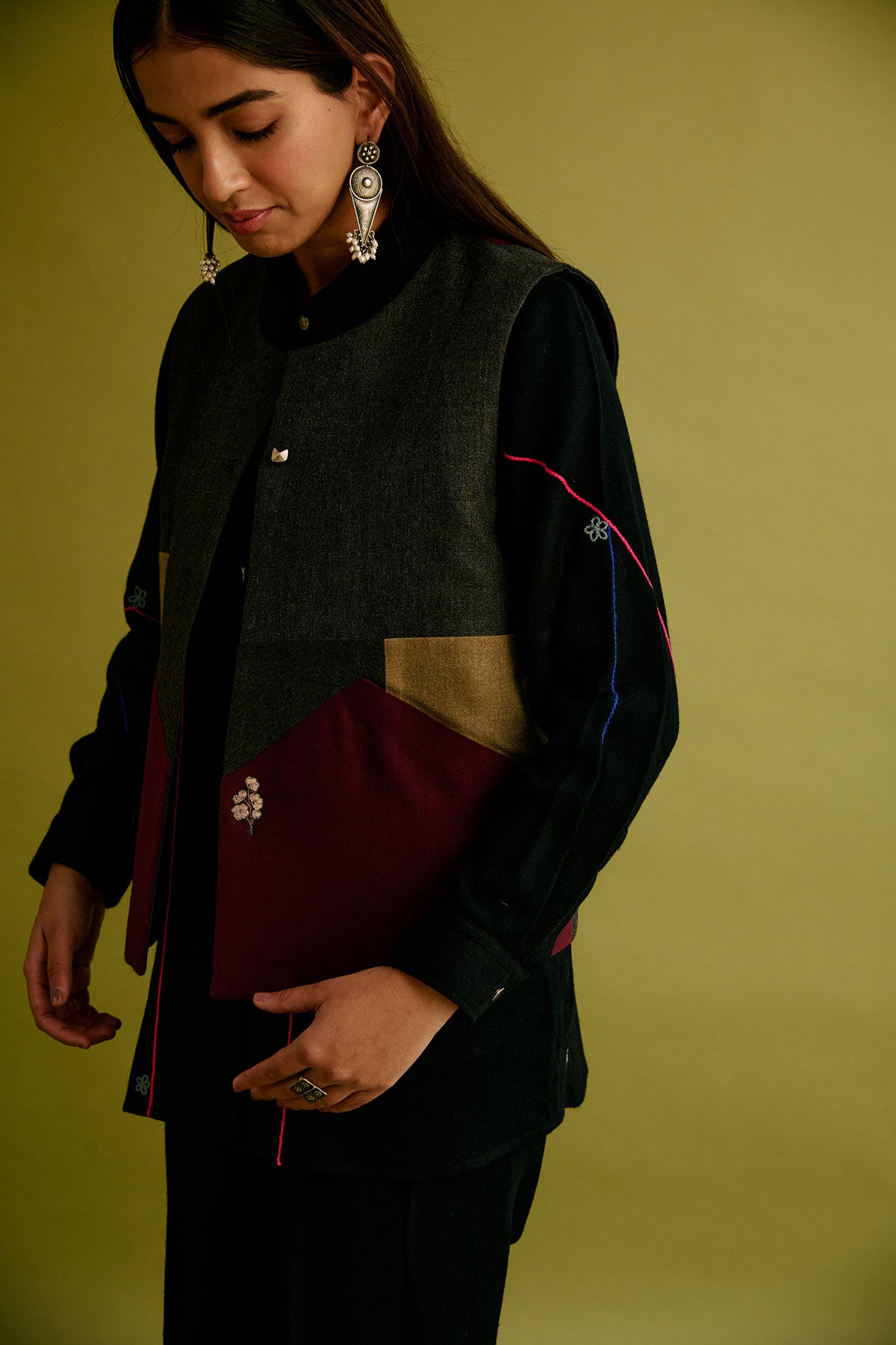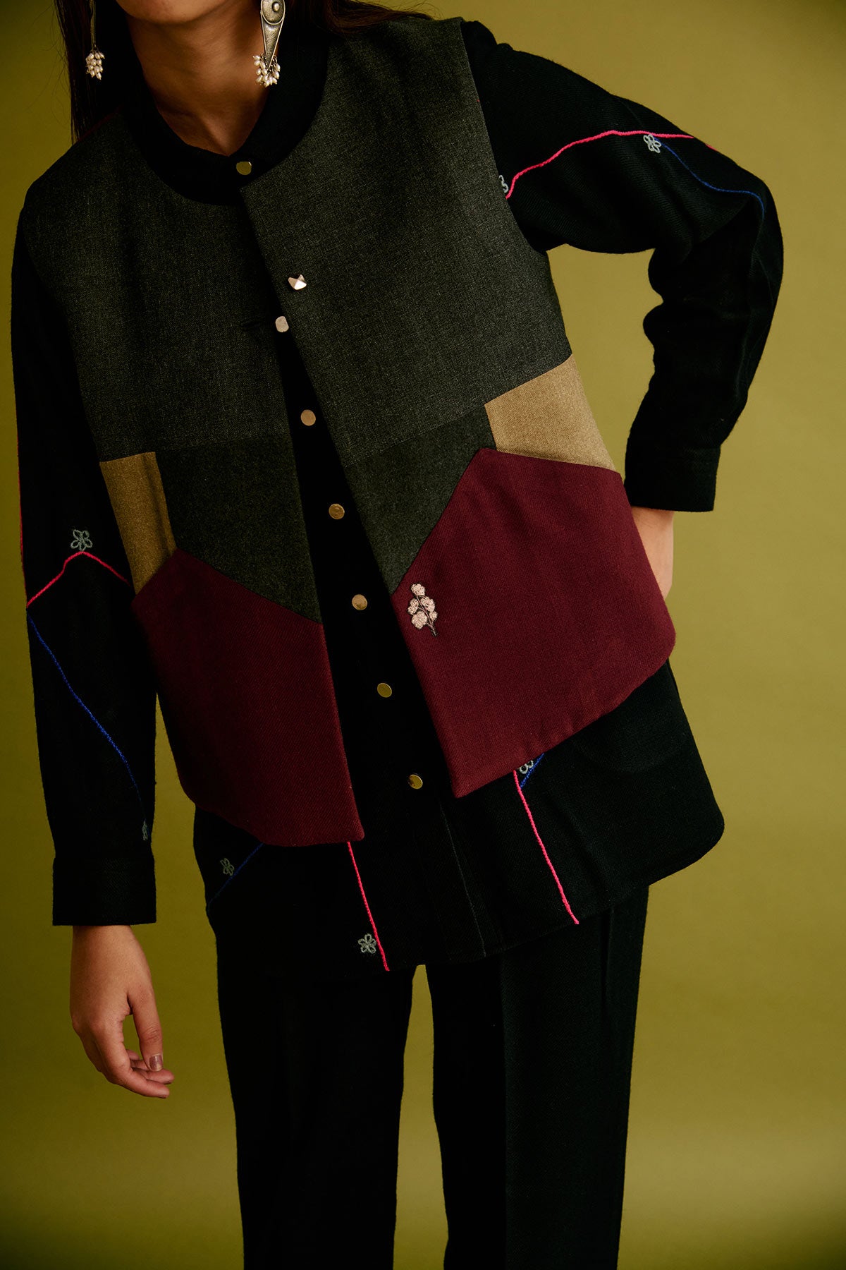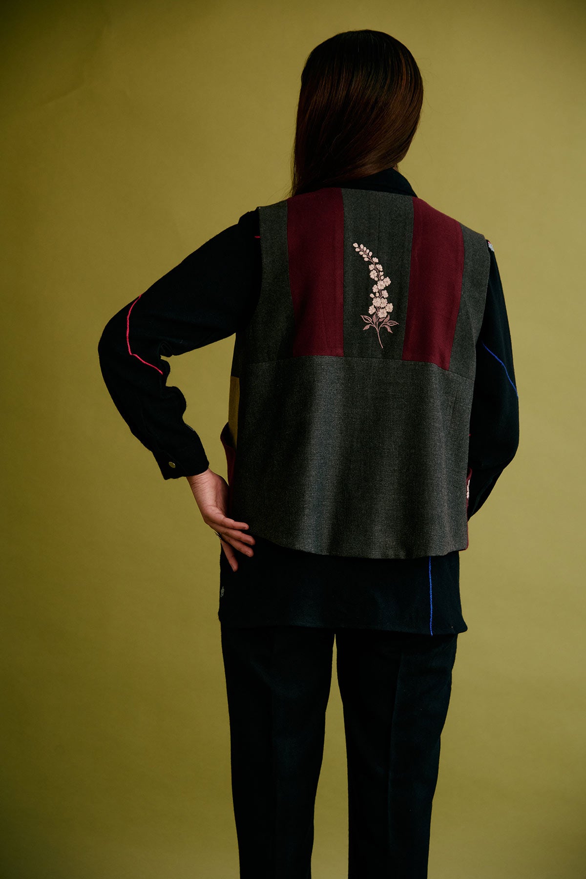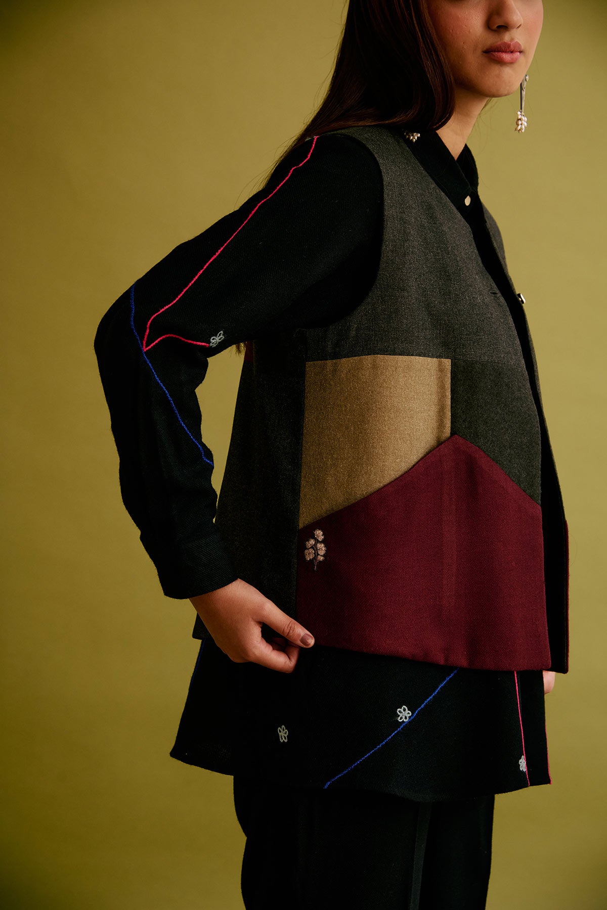 This Limited Edition half jacket is made of upcycled woollen fabrics highlighted with embroidered floral motifs on the front pockets and at the back.