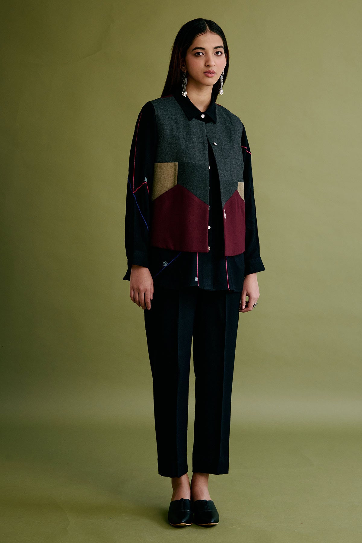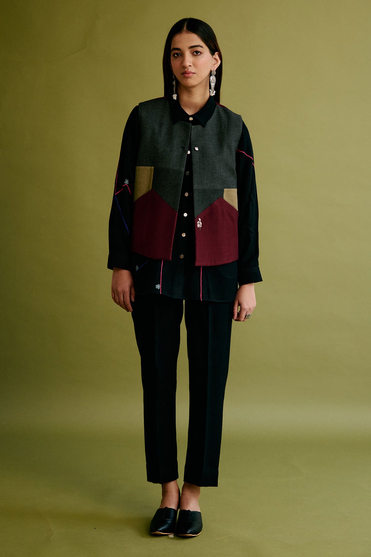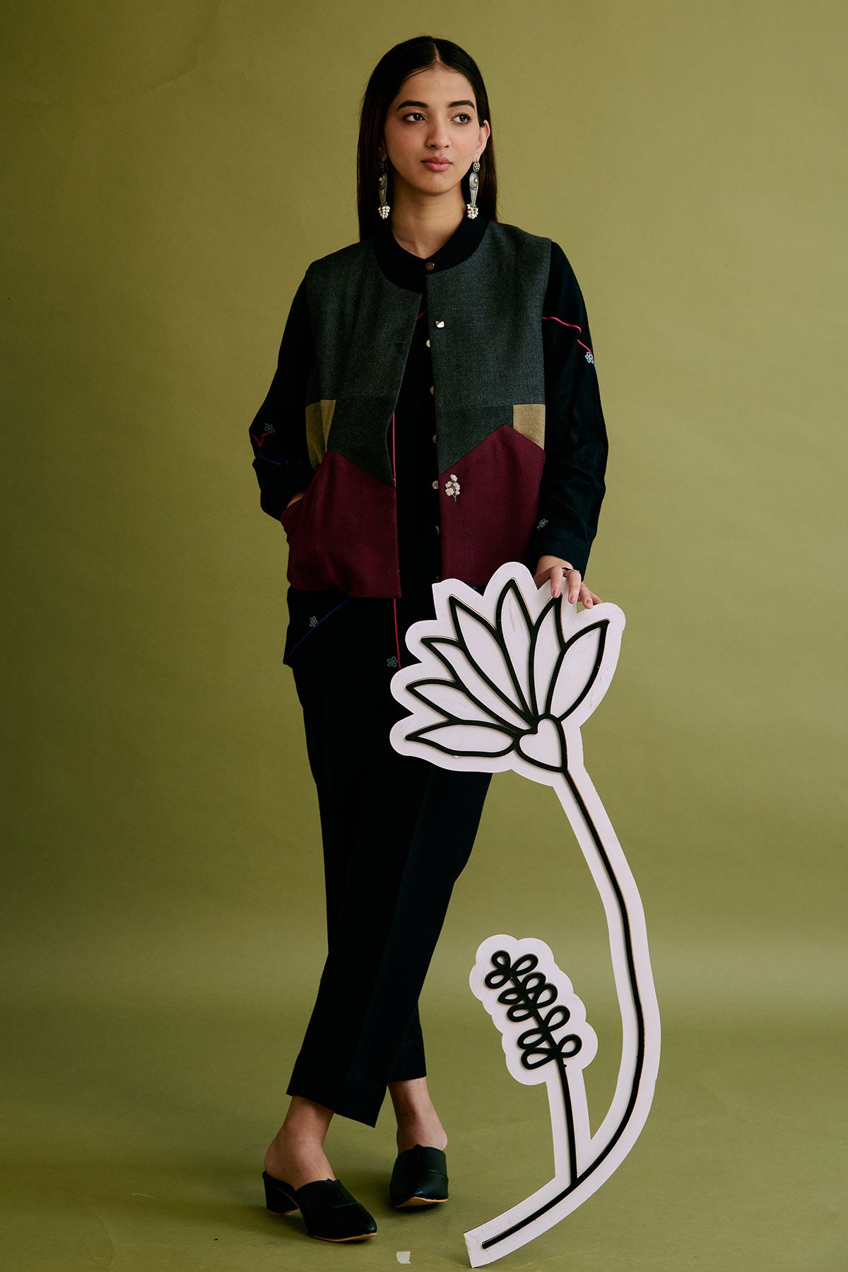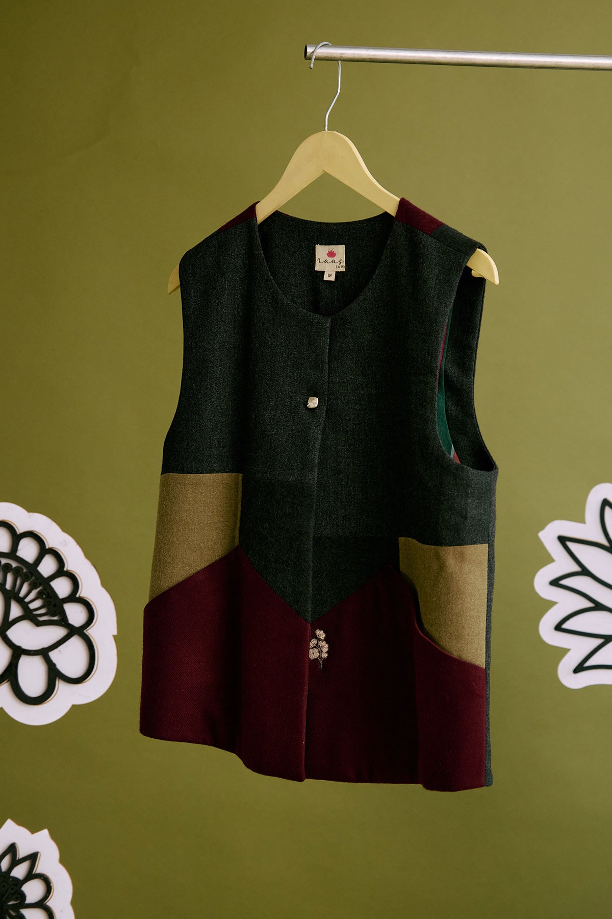 This Limited Edition half jacket is made of upcycled woollen fabrics highlighted with embroidered floral motifs on the front pockets and at the back.