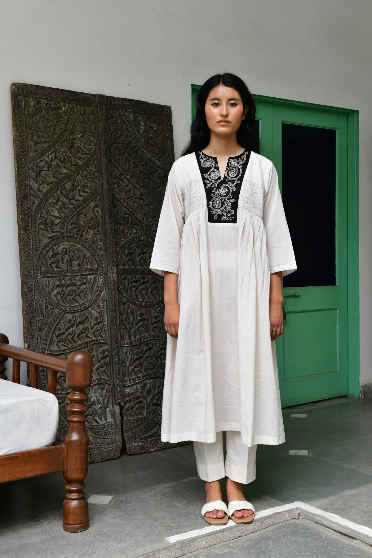 White kurta featuring contrast black embroidered yoke. Thread embroidery detailing is placed on the bodice—both front and back—as well as on the sleeves.