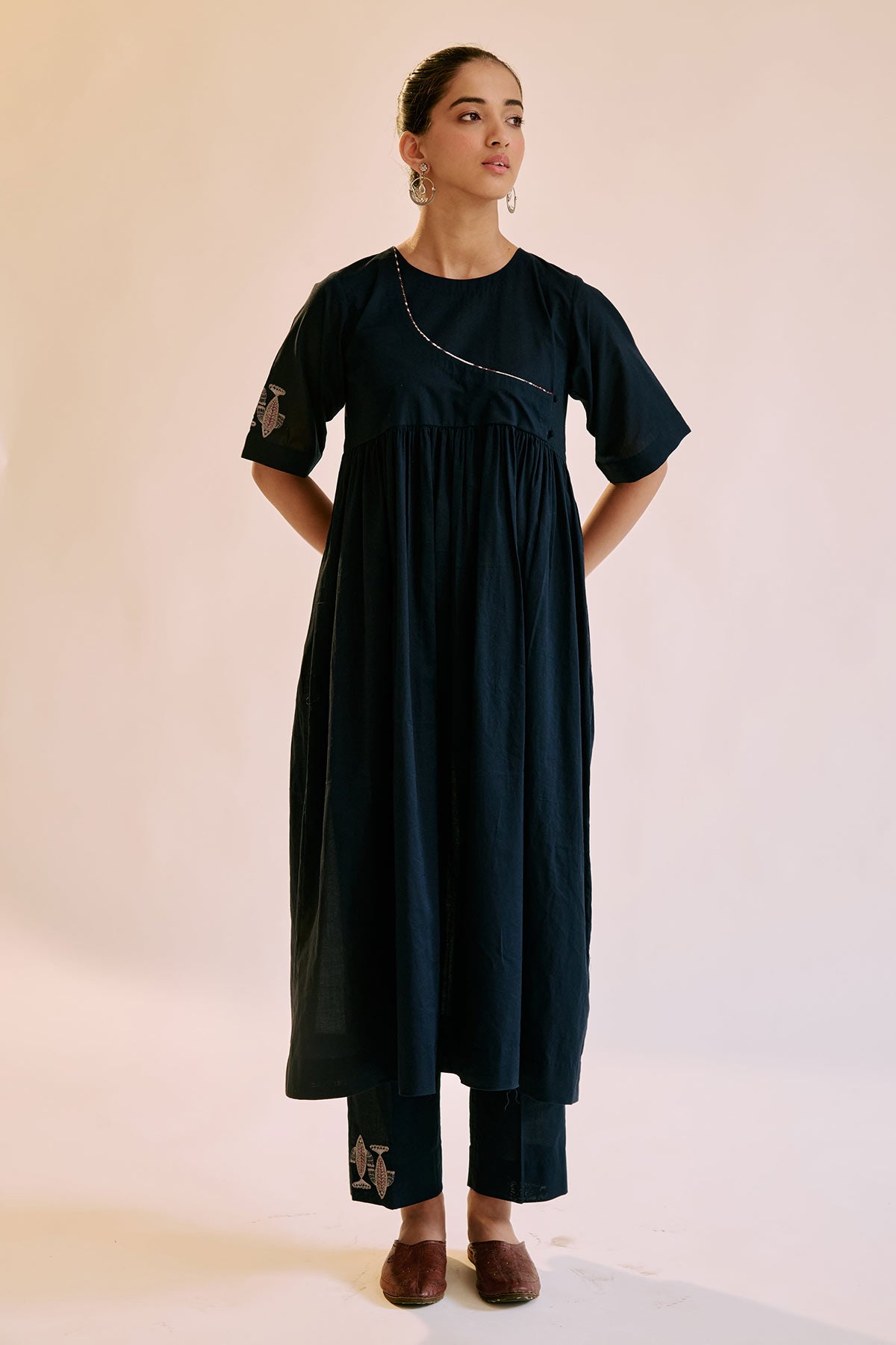 Round neck with angrakha style gathered tunic, with placement embroidered fish motif using zari & thread.