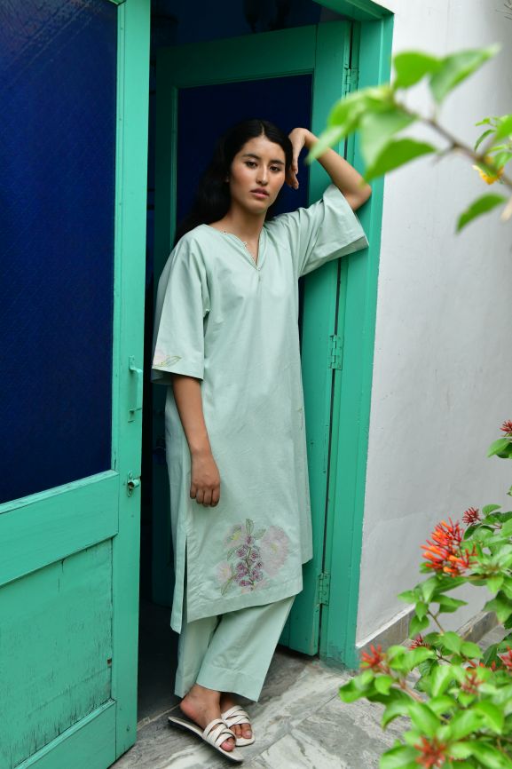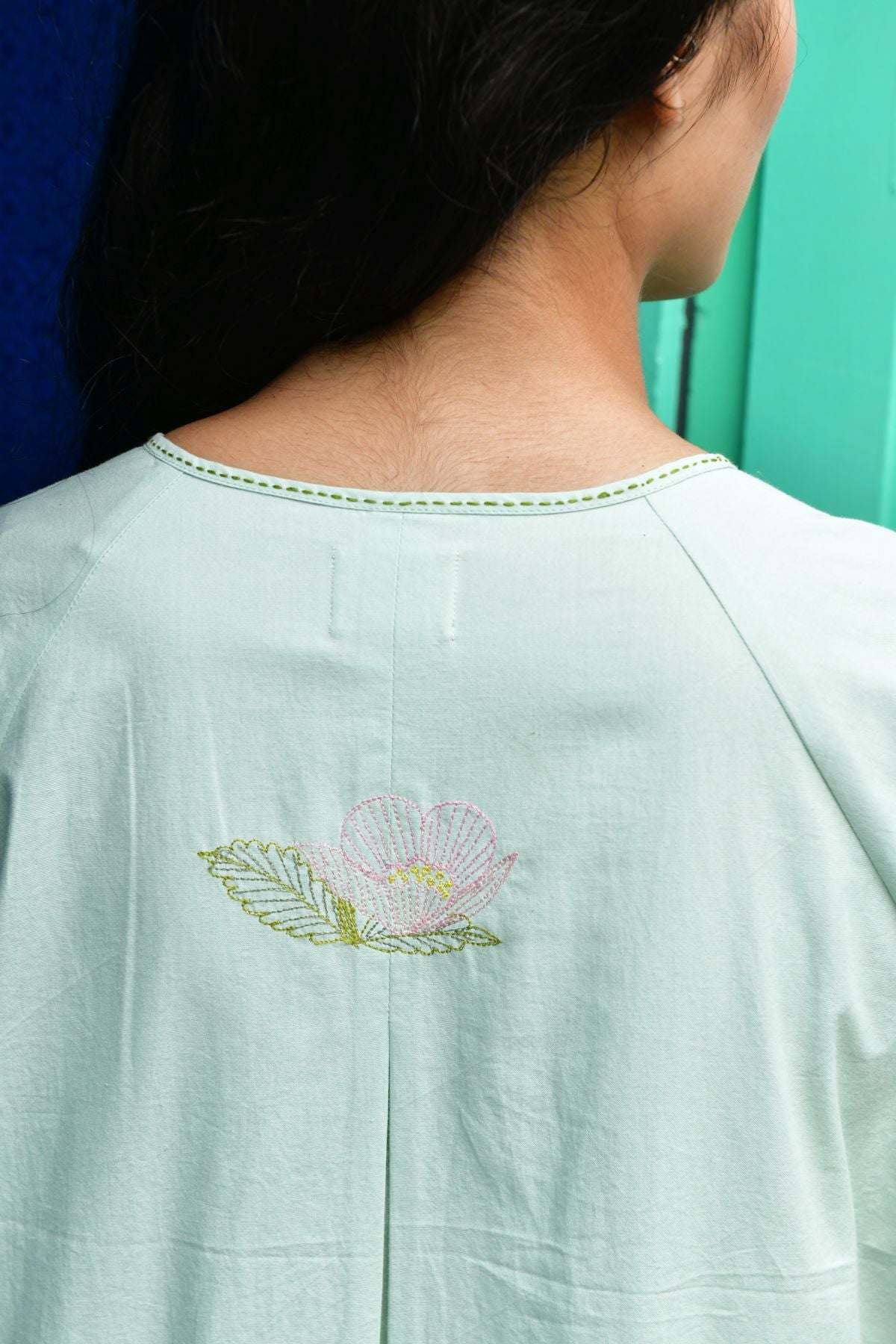 Crafted with cotton poplin fabric, reglan sleeve, round neck with slit, thread detailing on neck, placement pattern on front, back and sleeve.