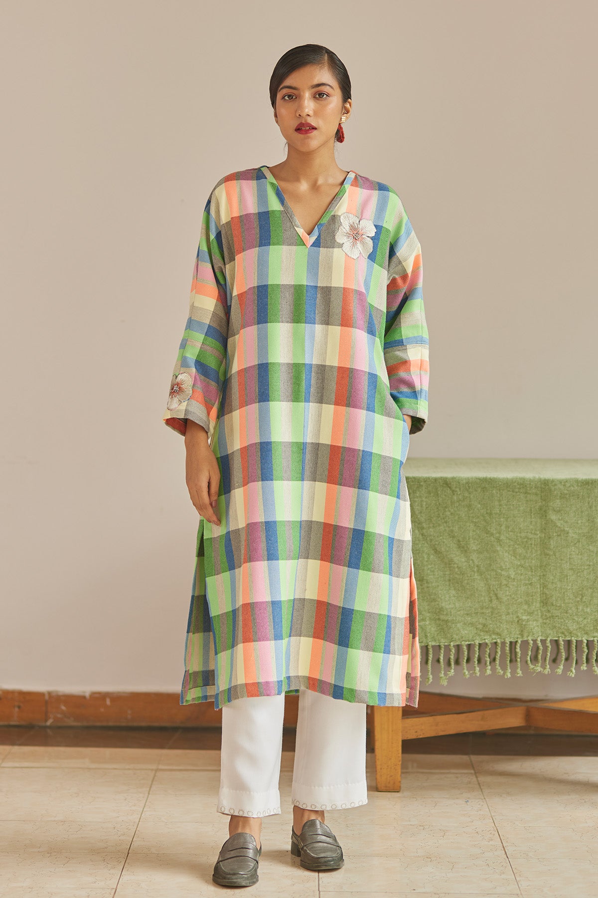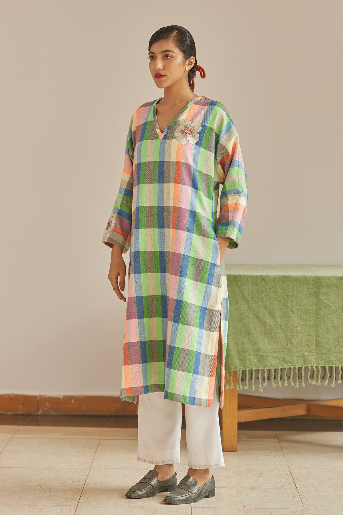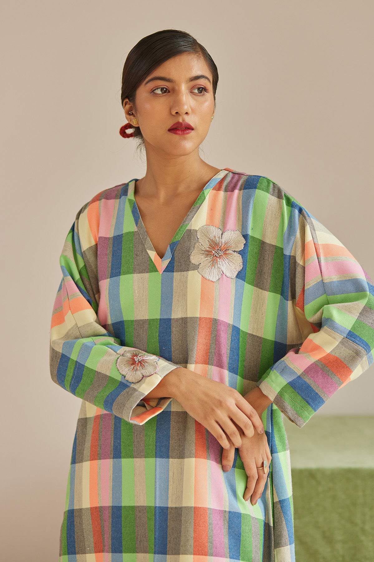Hand embroidered zari flower highlighted with beads on the side of the kurta and sleeves