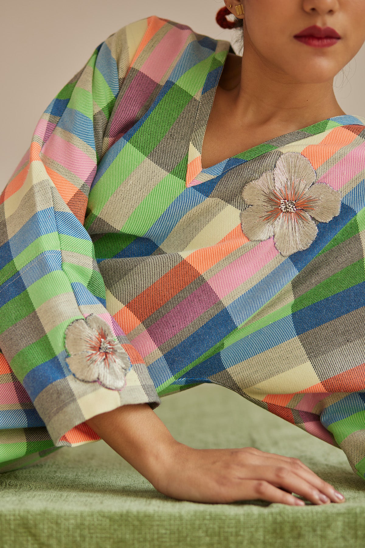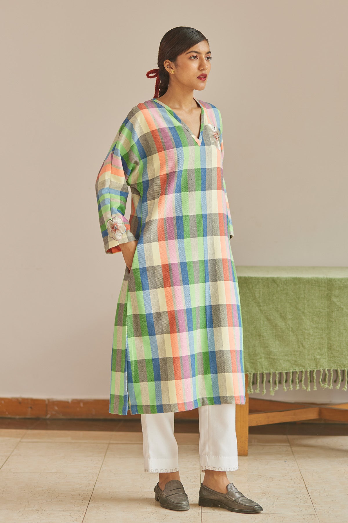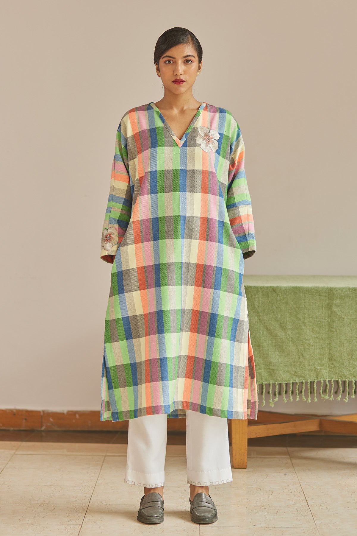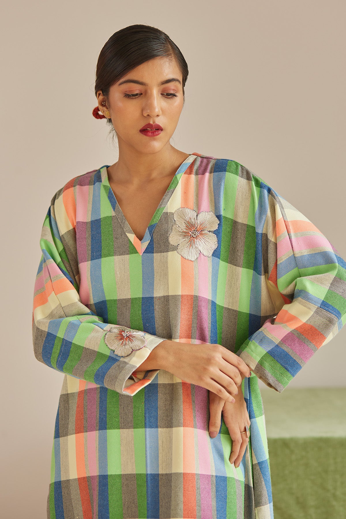 Hand embroidered zari flower highlighted with beads on the side of the kurta and sleeves