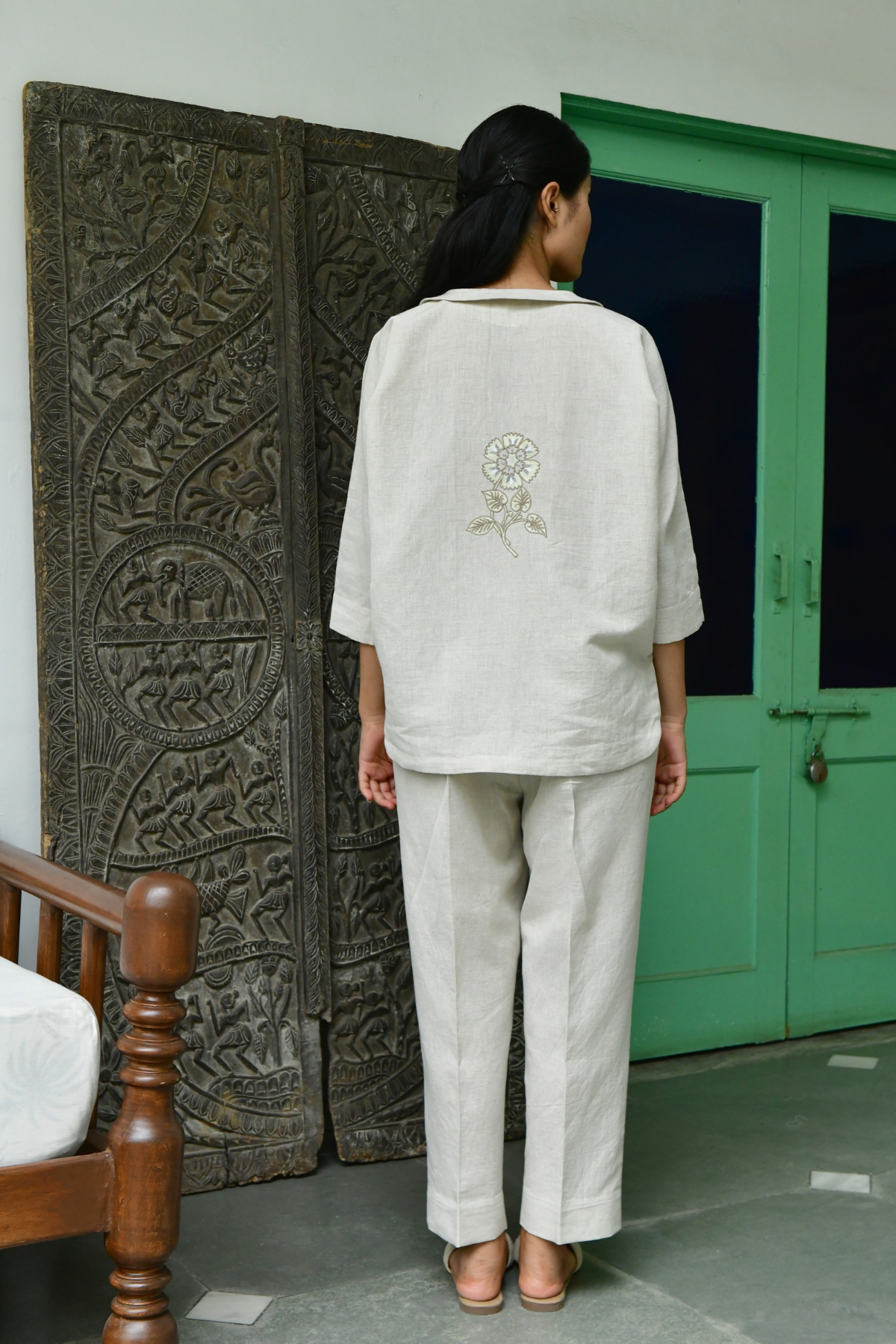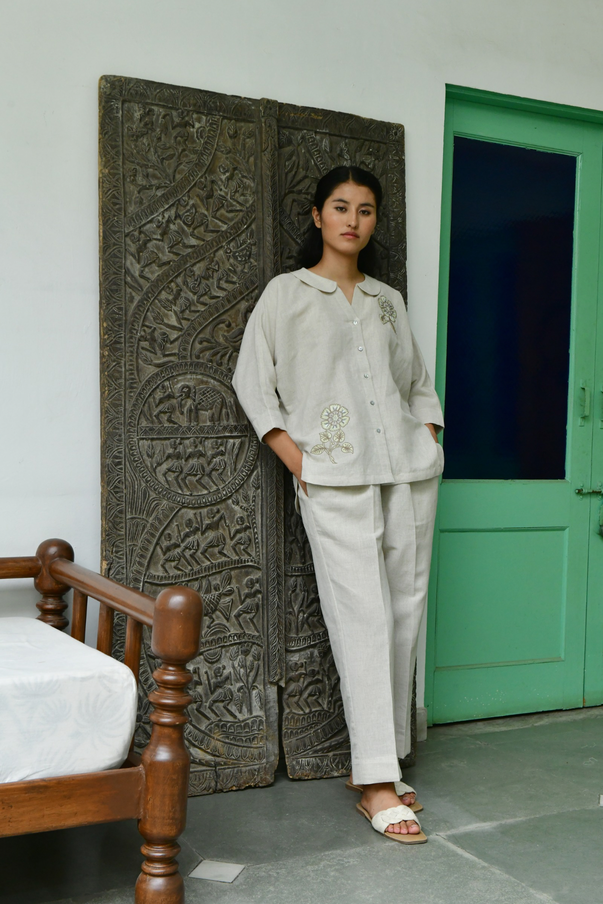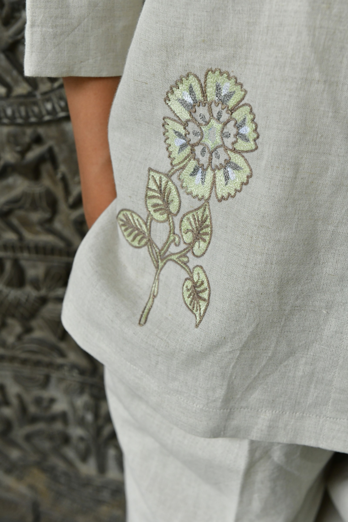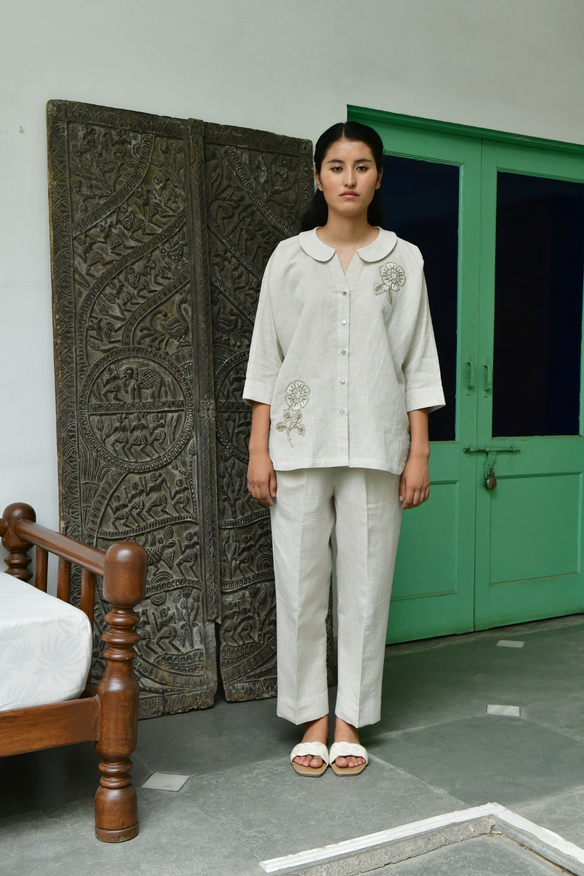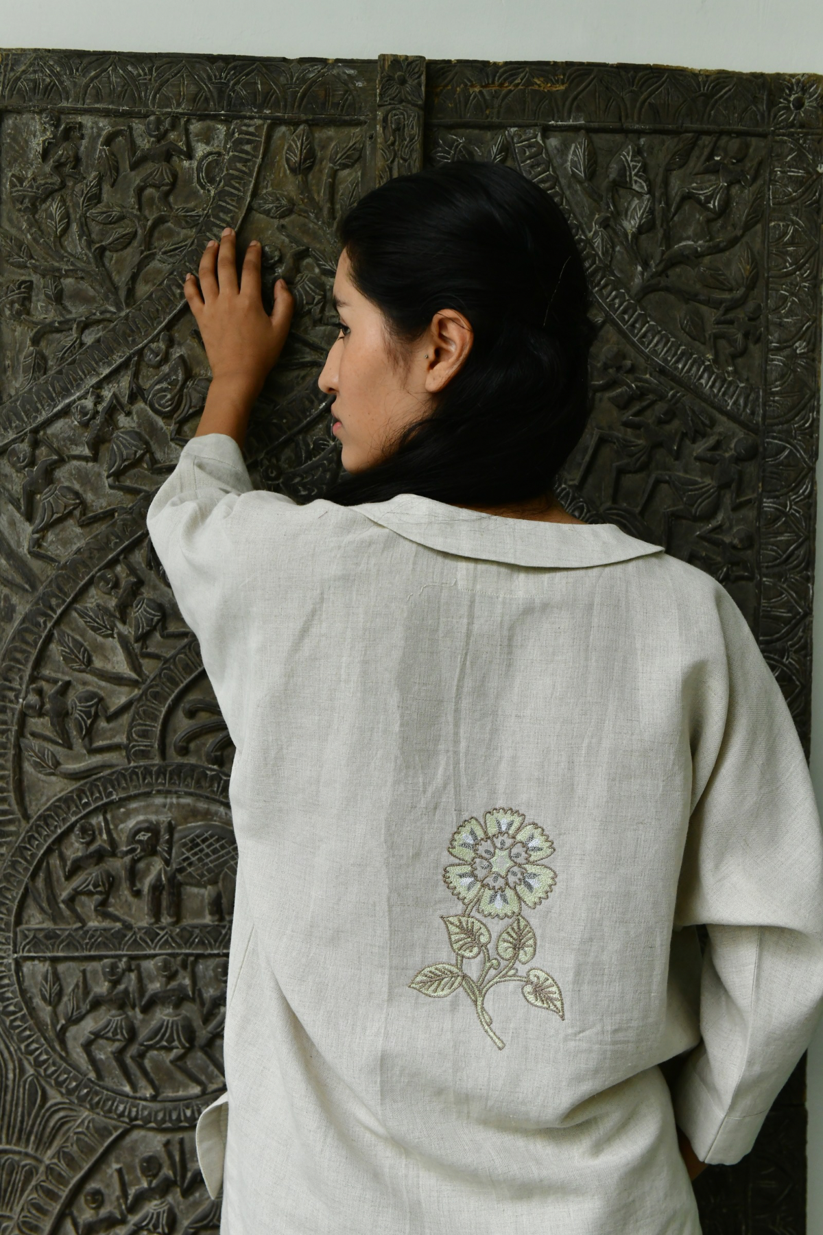 Crafted with linen fabric, peter pan collar and placement floral pattern on front and back