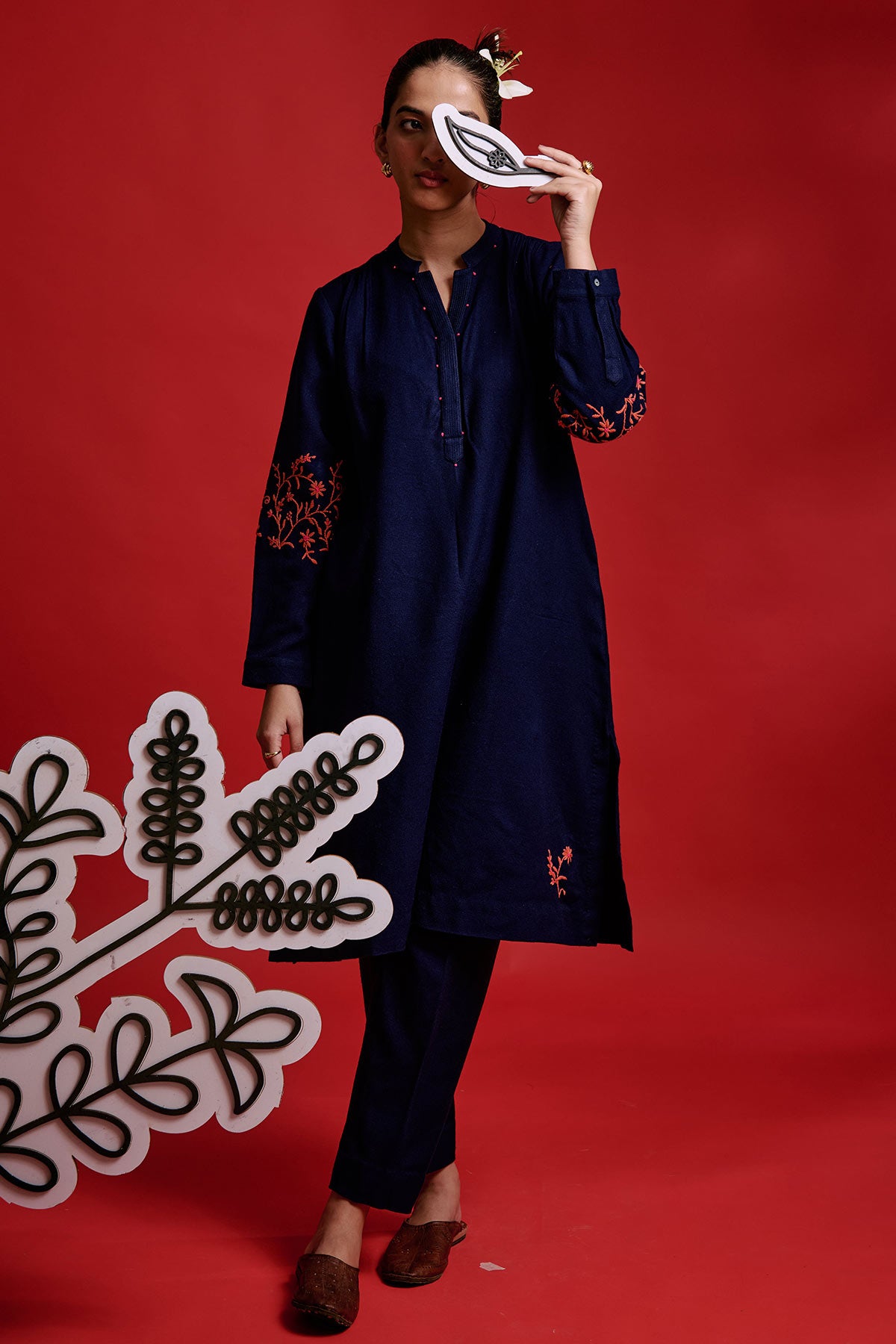 Straight tunic style kurta with placement sleeves embroidered and motif at the back.