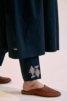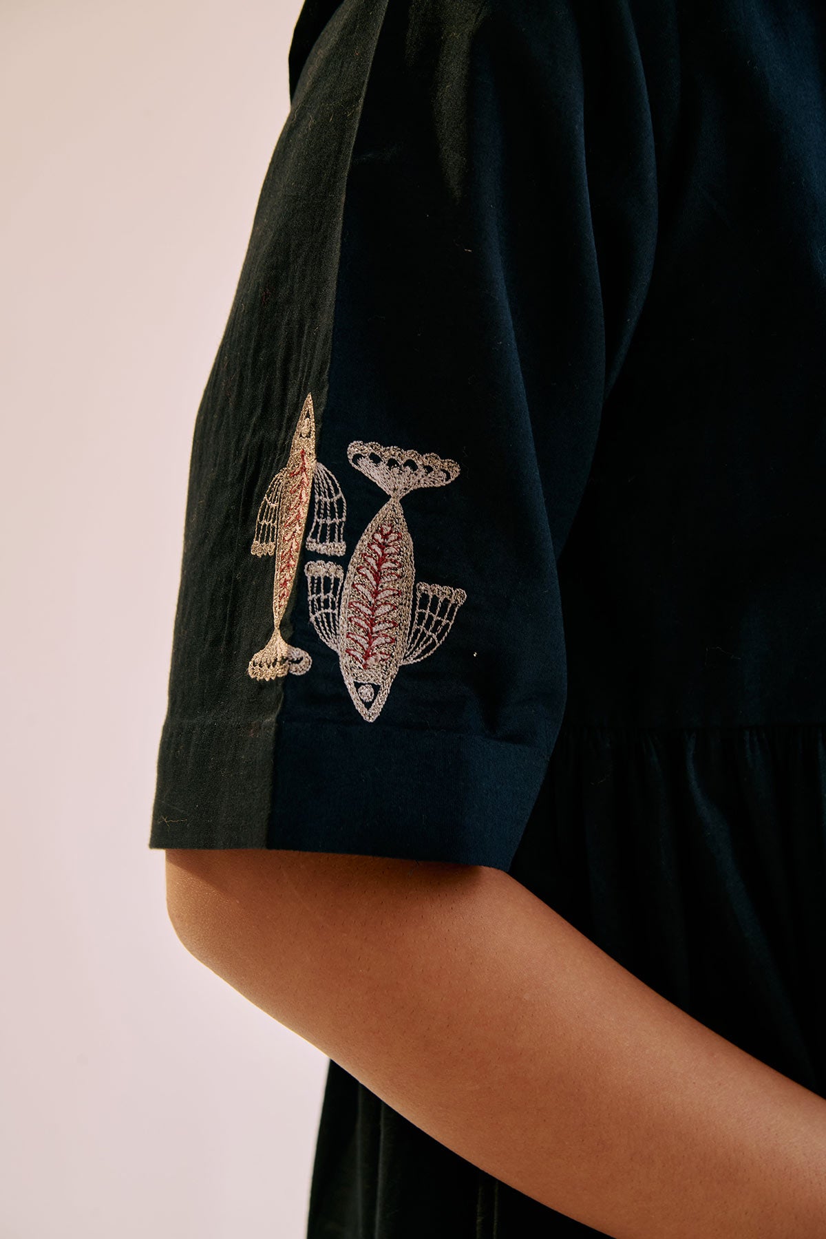 Round neck with angrakha style gathered tunic, with placement embroidered fish motif using zari & thread.